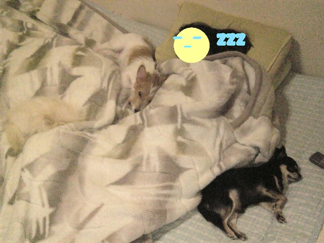 よく寝て、よく遊ぶ3ワン。 布団に入ると、ダッシュで集合する。 私と旦那、必ず寝てる方にベッタリ。 一人で寝たつもりでも、気付くといつの間にか3ワンにベッタリ囲まれてたりする。 写真…ちょっと暗いけど…散歩の後、ちょっとお昼寝