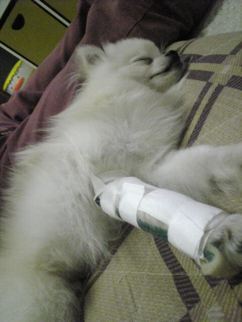 我が家にやって来て、10日後位に骨折した「もー」預かりママさんの所で違和感があった左前足をかばって右足にも負担がかかってたらしい。でも、何よりの原因は、生まれてから1歳までの多感な成長期をブリーダーの狭いケージのみの生活で、細いポメの骨が更に弱ってホントなんで今ので骨折?って事で、ポッキリ(T_T)骨折後、1ヶ月は、ギプスで完全固定! 1ヵ月後、ちょっと柔らかく、テーピング固定。2ヶ月になる少し前から、テーピングのみになり 4足歩行(走り?) も出来る様になり (Befor・・・)2ヶ月になる頃には、もう大丈夫と言われたけど・・・暴れ方が激しいので、念の為、部分テーピング。自分達で、巻き直しが出来る様になったので思い切って、バリカン登場! (After) 少しずつテーピング部分を狭くしていって、めでたく完治!ウチに来た時は、左足を時々上げて3本足歩行。あれ?4本で普通になってきた?と思ってすぐに逆の右足骨折したので、右足上げての3本足歩行。完治しても、しばらく(骨折3ヶ月後位まで)は、癖なのか右足あげてる事が、結構あった。だから実質、「もー」がウチに来てから3ヶ月位は、3本足歩行しかほとんど見てなくて、それが「もー」の普通だった。しばらくして、4本足で普通に歩く「もー」を見て「何か もーの歩き方変じゃない?」って思わず言ってたし・・・今は、本当の普通になって、元気一杯!元気過ぎて、また折れたら・・・と、怖い位。でも、「もー」の骨も、周りのお肉・筋肉もレントゲンする度、明らかに、しっかりしていっていたのは確認済み。後は、太りすぎて負担にならないように調子に乗せすぎないように・・・かな?もう大丈夫だよっ! by 今現在の「もー」
