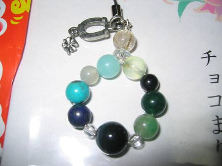 去年の誕生日にお姉さまのチョコまりん(ブログへ飛びます)さん チョコまりんさんのお店(お店へ飛びます)に作っていただいた、世界に一つしかない天然石のストラップいろんな石を組み合わせていただいて「これ以上の厄除けはない」というお墨付きを頂き1年間無事に過ごせました それが誕生日の翌日切れました後厄も終わったばかりで偶然だとは思いますが気になってしまってアマゾナイトがみつかんないぞ~なんてつまらないおやじギャグを言って直してもらいました狙い通りバレンタインデーに間に合うようにしかもチョコレートまでごちそうさまでしたあっもらうことしか考えてなかった