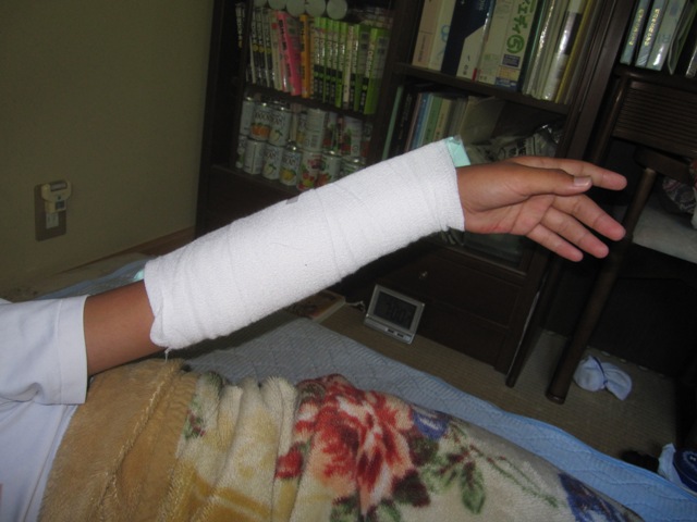 今日は秋晴れのいいお天気最高気温は27℃風も少しあり過ごしやすい1日現場確認のため車で出掛けましたが車内は暑いでも、窓を開けて走ると気持ちがいいですね 連休前のことですが仕事が終わって家に帰ると次男坊の右腕がこんな状態におちょこちょいですから自転車ででもコケたのかと思いきや健康診断で採血したら痺れて腕に力が入らなくなってしまったとか心配になって医者に連れて行きましたが原因は・・・採血の針が神経に当たったのかもという医者の見立て医者もびっくりしていました次男坊だけでなく他にも数人の被害者が次男坊が一番酷かったようですが今は痺れも取れました次男坊も心配しましたが採血した看護師さん・・・もっと心配かも今日は部活の大会それまでに直って良かったです結果はどうだったろう 週末はいいお天気の行楽日和寒暖の差が激しいのでご注意を良い週末を