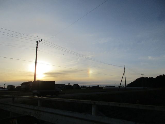 昨日がこの冬一番の冷え込みだったので今日は少し暖かでももちろん氷点下です昼間は風も弱く穏やかですが寒いですね最高気温1ケタ台でした現場に行ってもちょっとしか外に出ないのであまり関係ないですけどね今朝はちょっと雲が多め通勤途中に変わった現象が現実に見えた幻日だとおもう太陽と同じ高度の太陽から離れた位置に光が見える大気光学現象通常、幻日は太陽から約22度離れた太陽と同じ高度の位置に見えるそうです(詳しくは)片方だけ見られる時もあれば両脇に現れることも両側に出たってことは珍しいのかな幻日が見られるとお天気が下り坂という情報もありますがこちらはお天気続きそう見えたのが朝ですからねでも冬の嵐がご注意ください良い週末を
