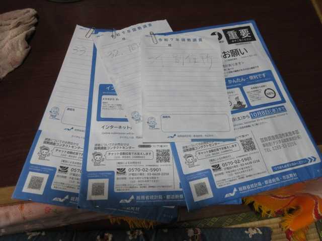 昨日は朝からいいお天気だったのに今日は朝から雲の多いお天気昼間も一日曇り空しかも風が強い台風22号の影響ですね日付の変わった頃が一番気温が高く昼間の気温21℃涼しかったです今年は国勢調査の実施年皆さん早々に回答されたようで我が家もやっと期限ギリギリにだって👹嫁様がやるっていうからほっといたら最終日に我が家は色々 もろもろあってジジババとは別世帯扱いなので解答用紙もたくさん個別に番号があるのでそこまでしなくちゃいけないのかとは思いますがなにかの役に立っているそう願っています
