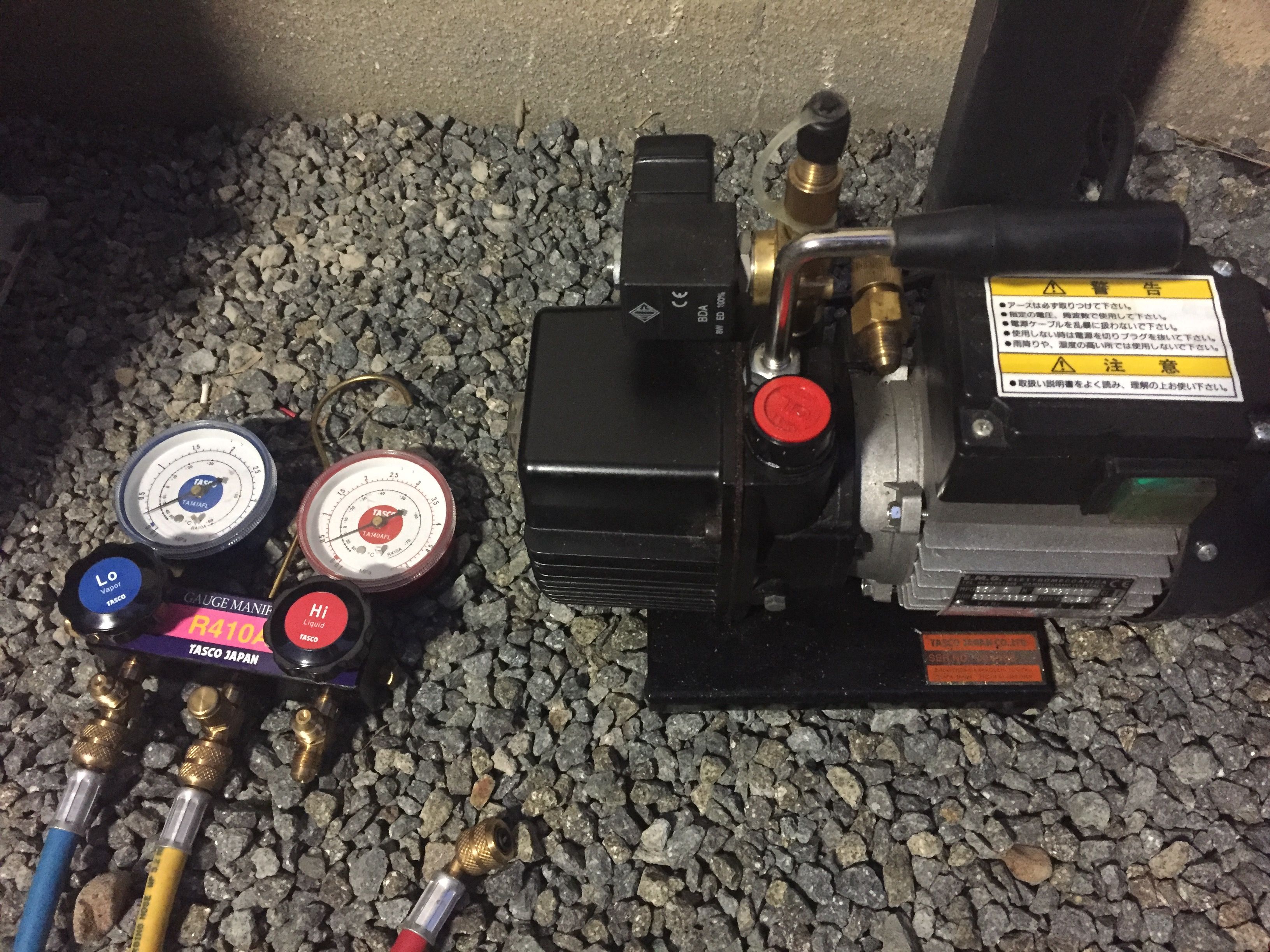 こんにちはようやく、すべての道具がそろいました。^^ホースを接続していきます。青いほうのバルブをあけポンプのスイッチを入れます。するとブーンポコポコと微妙な音を立てて真空を引き始めます。青いほうのゲージが-0.1のほうまで来たらOKです。30分ほど放置しておきます。30分後、-0.1を確認し、ポンプのスイッチを切って分ほど、放置します。冷媒管の気密がOKかどうかを確認。5分後、ゲージが0に戻ってなければOKです。(写真撮り忘れた^^;)問題ないので、青いバルブを閉め4mmの6角レンチを写真の位置に差しゆっくり左回りでガスを開放していきます。シュ!っと一瞬だけいいます。次に、青いホースをサービスコックから外します。この時も一瞬だけシュ!っとガスが抜ける音がします。最後に写真の位置に6角レンチを差しゆっくり左回りに回し、ガスを循環させれば完了です!さて、試運転開始!涼しー^^3畳の部屋なんで28℃設定でも寒いくらいです^^これで仕事もはかどります!ありがとうクーラーありがとう自分少しマニアな道具も必要ですが、意外と自分でできるもんです。よかったらみなさんも頑張ってみてください^^では
