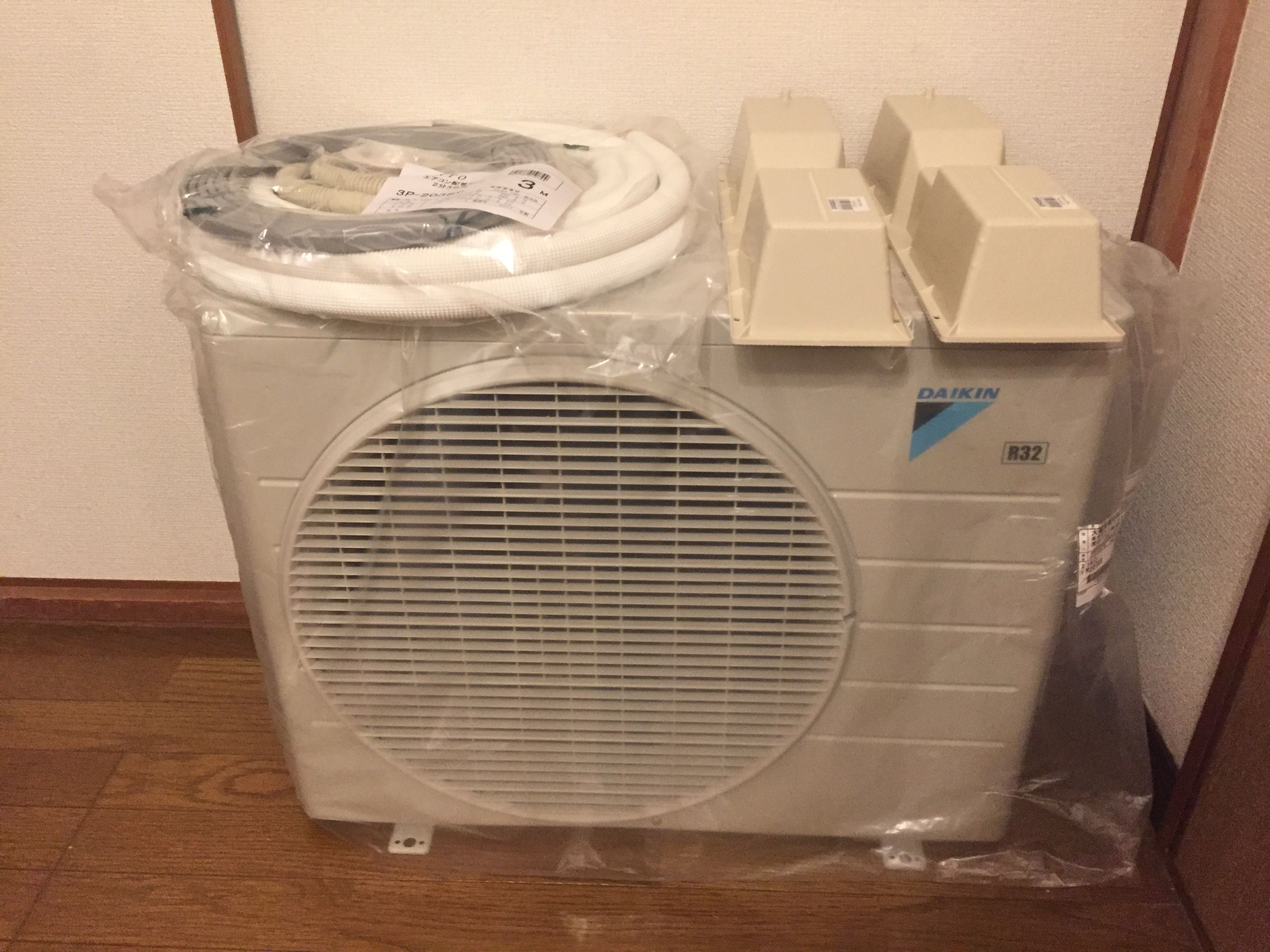 こんにちは自宅の3畳ほどの一室を事務所代りに使用しているんですがさすがにこの季節になると暑くて暑くて^^;朝方、早起きして、少し仕事をするんですがそれでも、1時間もせずに暑さの限界を迎えますね^^;毎年、毎年、なんだかんだで我慢してきたんですがさすがに今年はもう我慢出来ないということで先日、ついに買っちゃいました。↓↓↓【標準取付工事費込】ルームエアコン CXシリーズ おもに6畳用 2017年モデル S22UTCXS-W_SET送料無料 エアコン 6畳 ルームエアコン 工事費込 家庭用 季節家電 ダイキン(DAIKIN) 【TD】 【代引不可】今年はエアコンが全体的に高いような気がします。ここ最近の日本経済を象徴している感じですね。ルームエアコンは一般的に6畳用(2.2kw)が一番小さいタイプとなります。3畳の部屋にはキャパ以上の能力なのでもったいない気もしますが、すぐに冷えるし逆に経済的?かな?と都合のいい方向で解釈しておきましょう^^さっそく到着。さて、付けてみましょう。平日の仕事が終わってからの作業です^^;この部屋にはエアコン用の穴は開いていません。まずは、しっかり周りを養生して室内機をひっかける為のプレートを取り付けます。そして、穴をあける位置を墨だしして、電動ドリルでグリグリと穴を開けます。平日の夜の住宅街にドリルのうるさい音がこだまします。そこそこ近所迷惑だったかもしれません^^;無事、開きました。次に室内機を取り付けます。こちらは室内機を裏から見た状態。機械の裏に納まってる冷媒管(写真の黒いホース)を室内機に対して垂直に曲げます。この時、冷媒管はギュっと曲げるのではなくやさしく、ソフトに曲げていきます。冷媒管は柔らかい銅管なので無理やり曲げると、ポキっと折れてしまいます。気を付けてください。そして冷媒管の下にドレンホース(写真の白いホース)が来るようにテープで仮止めします。これはドレンの勾配を確保する為です。ドレンホースが冷媒管の上にくると逆勾配になり水漏れの原因になります。壁の穴に、配管を貫通させ、室内機を壁に取り付けたプレートの上部のツメに引っ掛けて、その後、下側のツメにもパチンと音が鳴るまで押し込みます。これでひとまず、室内機の取付は完了です。パチパチ。第一段階は完了です。今日は夜遅いので、ここまでといたします。次回は、室外機の据付、冷媒管の接続、気密試験、真空引き、試運転と進めていきます。マニアックな工具も必要とされます。出来るだけ多くの方にわかるよう写真を撮り忘れない様に気を付けます。では、また。●新品 DAIKIN ダイキン 8畳用 ルームエアコン Eシリーズ F25UTES ホワイト【1】【中古】↑中古でもガスさえ入っていれば大丈夫ですよ^^安いですね今回使った道具。・日立インパクトドライバー日立 14.4Vコードレスインパクトドライバ 黒【品番:WH14DSL22LSCKB】【日立工機(株)】【RCP】・マキタ電動ドリルマキタ 無断変速ドリル 6412 電気ドリル 88381082150・ドリル用乾式コア70φユニカ ALC用コアE&SES-A70ST