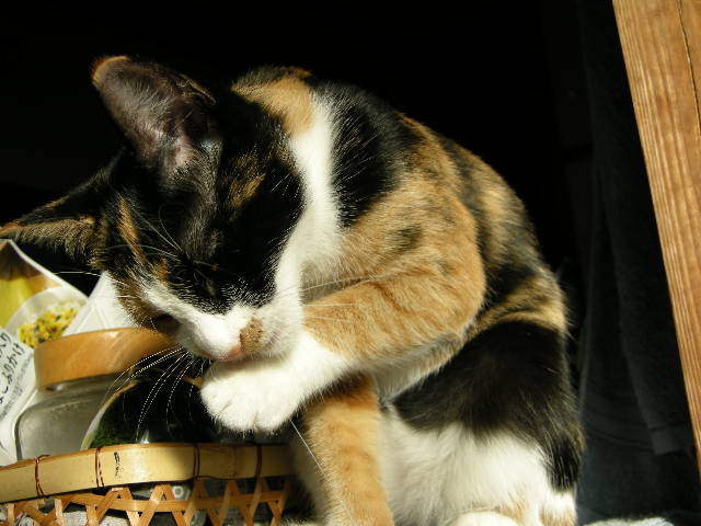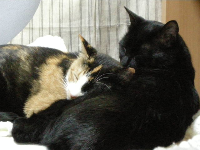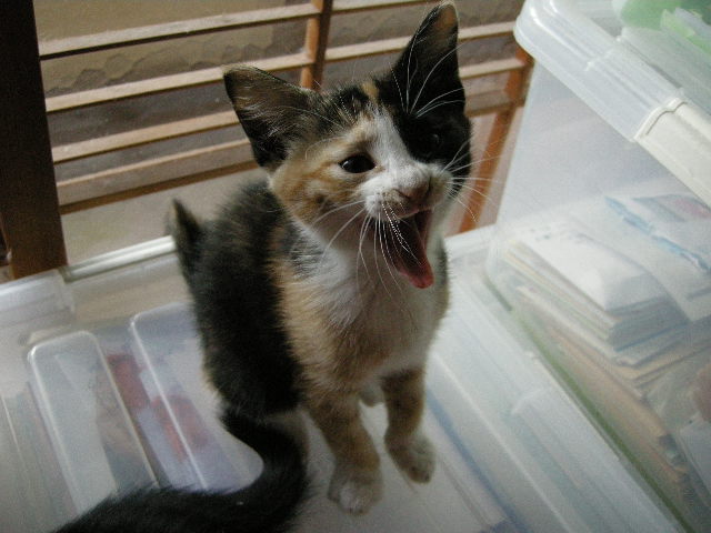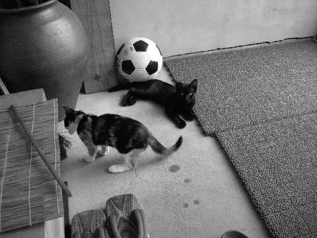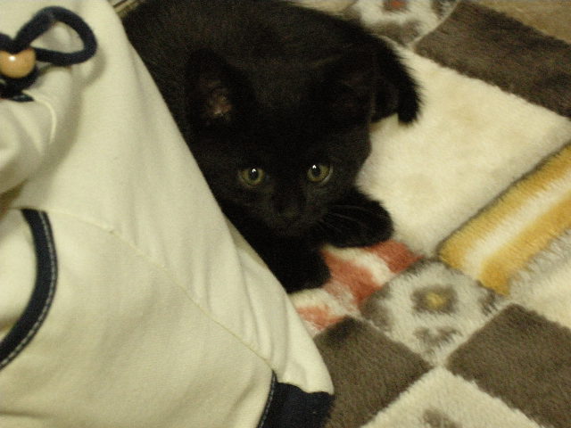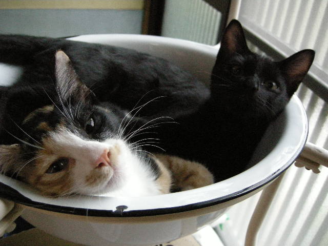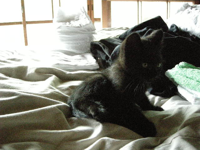 みなさん、おはようございます鳥のさえずりの中、ゆる~く お送りしています。(聞こえへんけど)しろくまの、(タイトルコール お願いしまッす)せーのーでっ………。はぁ~。 (・・・。 疲れてんのかっ )今日の話題に行きましょか?やめとく?やっぱり、行っとく?いや~、やめとこ。(なんでやねん 早よ)TANちゃん、来日?3日目にして早くも洗濯物の上でリラックスしております・・・。そんな、リラックスも束の間。TAN様の天下を揺るがす大事件がっっあっはじめましてぇ「ちゃめ」といいますぅ4月26日産まれの♀です。みなさん、よろしくねっおおっ二匹目のドジョウ・・・じゃ無くって二匹目のネコちゃんでした。実は、飼い主さんの都合によりTANちゃんの姉妹ネコをもう一匹譲り受けることになったのです。とはいえ、先住の功あろうTAN様。一体どのような対応をなさるのか・・・。ここは、一歩引いて観察、観察、楽しみ、楽しみっと(意地悪そうな顔の しろくま。)すると、びっくりちゃめちゃん、いきなり餌にガッついてます・・・TAN様もびっくりあっけにとられて手出しが出来ません・・・。無事に、腹ごしらえができたちゃめちゃんをみて、「ちょっと、あんた 来なさいよ」とやや 切れぎみにちゃめちゃんを別室へと連れて行くのでした。この後、二人の関係はいったいどうなることかしろくまは無事眠れるのか?・・・・。(つーか、 寝られんかったので、ブログしてるんですが)というわけで、最初のため息の理由お解かり頂けたでしょうか?しろくまに、励ましのお便りお待ちしています・・・。( はぁ・・・。 )