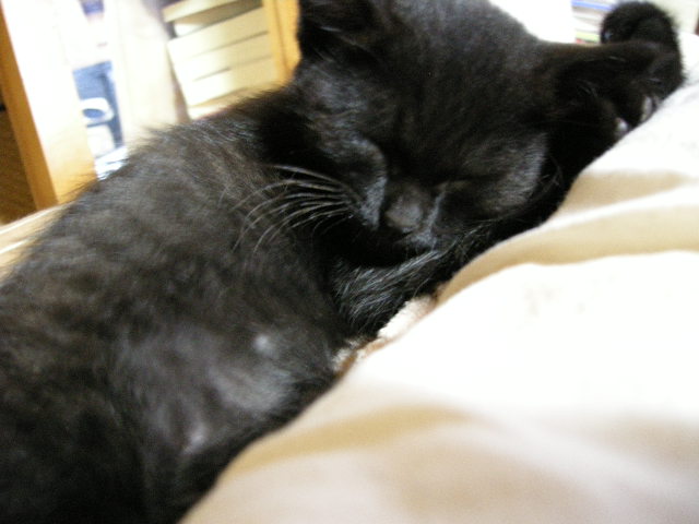 おはようございま~すいまだ、梅雨もあけませんが、ツユは冷蔵庫にたっぷりとある 今日この頃。如何お過ごしですか?(意味がわからん)いや、だから「梅雨」と「ツユ」を掛詞にして・・・。(わかった、わかった、早よ 今日の話題に行って・・・冷たいにゃ今日のTANちゃん少し慣れたのか 寝ています。で、起きたら遊ぶ。んで、また寝る。この繰り返し。パターンが読めず、しろくま、今日も寝不足です。決して同じでは無いでしょうが、子育て中のお母様方の気持ちをお察しいたします・・・。でも、愛らしい鳴き声と仕草に、「ま、いっか・・・」となってしまうのです本日最後のキュートポーズでしたっ