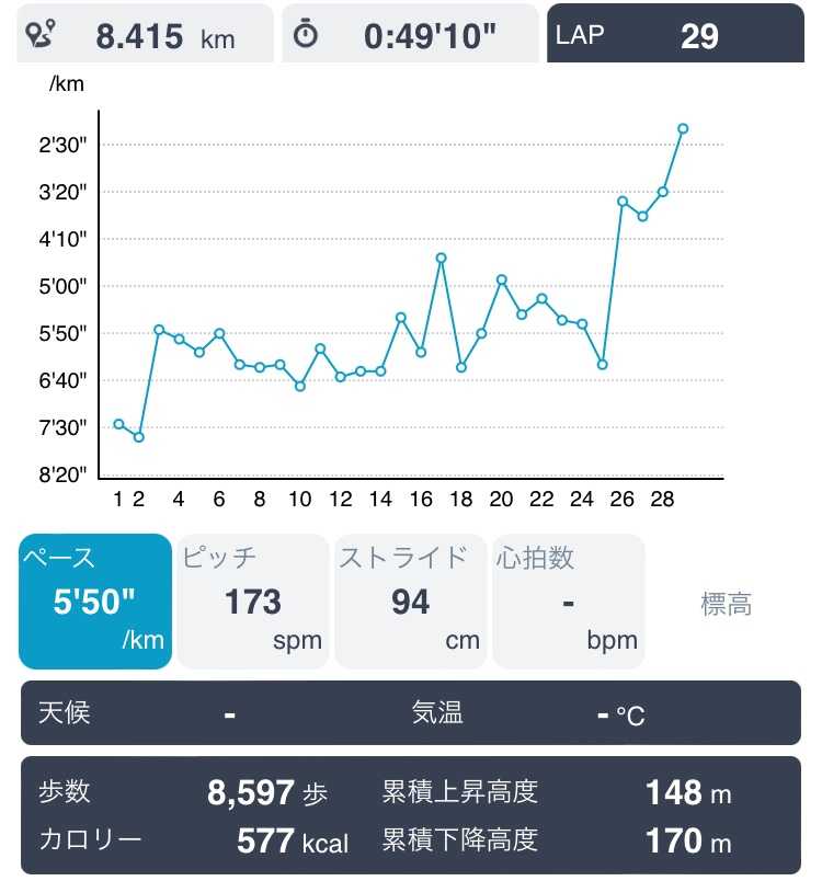 今日は8kmかな😁 後半はキロ5分ペースだな。まだまだだけど、いい感じ😌 キロ5分が当たり前になれば、次の段階に行ける😊頑張ろうっと💪