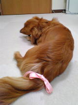 可愛いピンクのリボンを見つけた。龍之介にいたずら・・・ではなく、お洒落になってもらいたいと『おやつ』を食べている隙に付けてみた。『おやつ』に夢中で気付いていない?・・・・・・・・と思っていたら龍之介「何しゅるでしゅか」『おやつ』を食べ終わった直後に外されてしまいました。ごめんなさい。( ̄ヘ ̄)ちぇっ~人気blogランキングへ