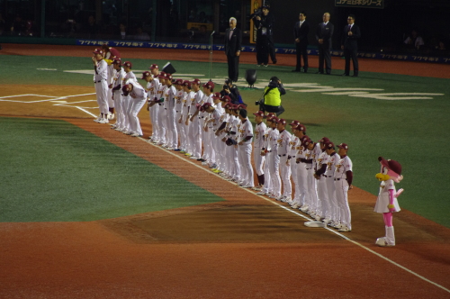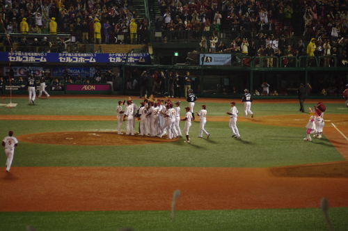 お疲れ様です。最終戦は惨敗でした特に投手 大丈夫か???さあ 木曜日からCSだこれからが本当の戦い」だぞ! 嶋 CSへ 「これから本当の戦い」 日刊スポーツ <楽天4-10オリックス>◇13日◇Kスタ宮城 楽天はレギュラーシーズン最終戦を白星で飾れなかった。投手陣が打ち込まれ、大差をつけられた。試合後は星野仙一監督(66)以下、コーチ陣、選手がグラウンドに整列し、セレモニーが行われた。 代表して、嶋基宏捕手(28)が「この寒い中、この寒い試合の中、たくさんのご声援ありがとうございました。今シーズンはファンの方々と、優勝という最高の喜びを分かち合うことができました。しかし、これからが本当の戦いです。CS、そして日本シリーズ進出を目指して、ファンの皆さんと一体になって頑張っていきたいと思います。これからどんどん寒くなっていきますが、選手と一緒に、この仙台、東北を熱く盛り上げていきましょう」とあいさつ。大きな拍手を受けた。 外野は旗が振られてるので隙間から狙ってパチッ!難しい~試合中の写真は明日載せますね。ポチっとクリックお願いします。にほんブログ村