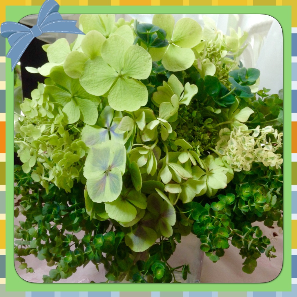 これは、まだ生花の紫陽花です。 嬉しい事に、日陰の家は、紫陽花、キレイに秋色紫陽花風になります。秋まで花を付けておくと、次の年、花が付きません。 半分切って置けば、半分咲きます。紫陽花切らずにほかって置けば 蕾を切ることなく、咲きます。アナベルは例外で冬に切っても咲きます。 詳しくはこちらに https://horti.jp/1583 紫陽花と緑の濃いのがユーホルビアです。まだドライではありません。 緑の大きいのが、白の綿帽子、小さいのがアナベル、青く残っているのがマース 右端は、ホジーブーケです。 物干し角ハンガーに紫陽花をぶら下げています。夫は嫌がりますが・・・ 柏葉紫陽花、ドライになると、白い所が茶色になるので、 茶色の所は、 切りますが散る事はありません。 右の画像がドライ後です。 本当はもう少しキレイな緑なのですが、なかなか色が出せません。 て言うぐらい、とっても素敵な色なんですよ。 真ん中の緑の八重の額紫陽花がシンデレラです。 ホントはこんなにギュウギュウに詰めずに隙間をいっぱい開けますが 撮影上、みすぼらしかったので、きれいに見えるように、くっけました。 ク-ラーの前にぶら下げて、下から扇風機を掛けます。 光もあまり当てない方が色が綺麗に残ります。 きれいに色が残ったもので、リースを作ります。 しっかり 久しぶりに 明日は、義姉さんとお買いものです。 恒例の、母のお金で2人各々好きな物、お中元という事で頂きます。 (これは元気な時から、母は2人に同じように買ってくれていましたので) も、食べようっと で介護も、もろもろ