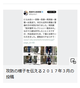 広島・尾道の黒猫「ケンちゃん」天国へ…市立美術館警備員との「攻防」がSNSで話題に|Infoseekニュースネコの街・広島県尾道市を象徴する存在で、同市立美術館への侵入を試みる様子がSNSで話題を呼んだ雄の黒猫「ケンちゃん」が死んだ。同館が11日、公式Xで明らかにした。ネコが入るのを阻む警備員との<攻防>の様子がSNSで国内外に拡散され、来館者の増加や同市の知名度アップに貢献していた。ケンちゃんは近くの飲…【全文を読む】最後の攻防戦https://x.com/bijutsu1/status/1781090301123403909?s=20ランキングに参加しています。クロちゃんをポチットお願い致します。にほんブログ村