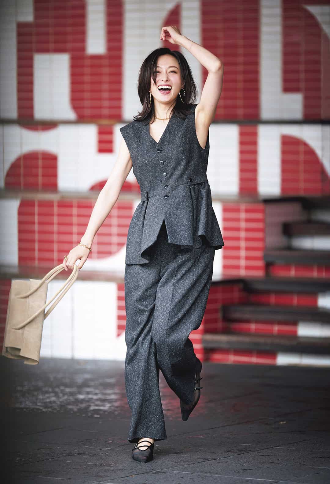 「ジレセットアップを“ワンピ見え”で上下同素材」が近道。重心コントロールは足元カジュアルで旬に寄せて。