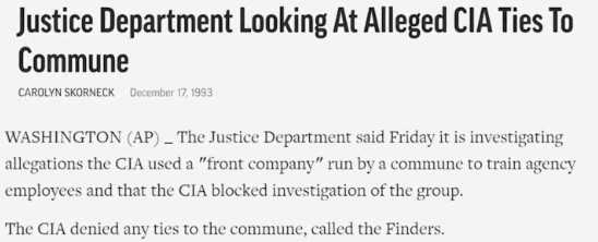 司法省は、 CIA が職員を訓練するためにコミューンが運営するフロント企業を利用したという疑惑について調査を開始した。