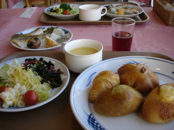 朝食バイキング:なんてったって、焼きたてパンがおいしい!種類も多い。なくなり次第終了