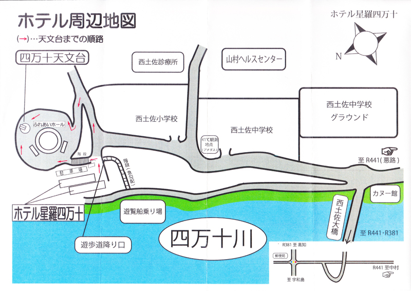 フロントで「ホテルの周辺を歩いてみたい」と言ってみたところこんな地図をもらいました(画像クリックで大きく表示されます)川に出れないか聞いてみたところ、地図にある遊覧船乗場への遊歩道はかなりワイルドで危険だと言われ断念まずはホテル裏の高台にある四万十天文台に駐車場から階段を上がってすぐありました天文台では、星空ガイドさんによる天体望遠会が20:00-21:00まで開催されていて(水曜定休)前日までにホテルに電話で予約すれば参加できるようでした痛恨のノーチェックただこの日は雨で何も見えないとフロントのお兄さんに慰められる始末(笑)料金は高校生以上500円、小・中学生300円、小学生未満無料続いて、西土佐中学校にあるアメダス観測地点へホテルから坂道を下って歩くこと約5分左側のポールがあるあたり『江川崎地域気候観測所』となってます2013年8月12日に国内観測史上最高の41.0℃を記録したところです当時の新聞が貼ってありました高知新聞webの記事→ここそういえばアメダスって意識したことなかったかも中学校前の坂道を下っていくとカヌー館に出るようです雨も降ってたし、坂やしで戻ることに例の遊歩道入口「こちらから川へおりられます!」の看板の上に「ヘビに注意」確かに安全とは言えない雰囲気最後にガイドブックで見て気になってたカフェストローベイルSANKANYAふるさと市の隣のようです営業時間が終了してたので場所だけチェックホテルから見たところ四万十川の対岸にカフェのテラス席らしきものが見えましたホテル星羅四万十