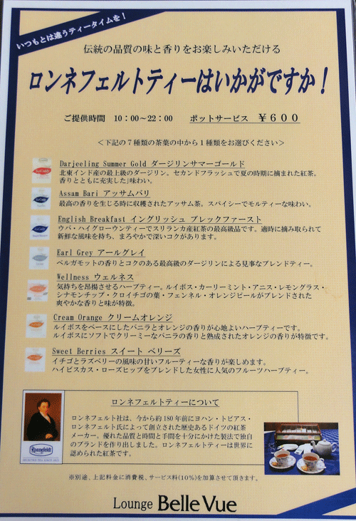 もひとつニューオータニ鳥取の追加情報ニューオータニに行くと決まったら、どーにかしたいのが「プレミアムパンケーキをいつ食べるか」14:00/15:00~17:00(オーダーストップ16:30)これがネック以前アップしたパンケーキの日記はここ今回はどーにも時間が合わなかったので、ロンネフェルトティーにしてみました10:00~22:00と時間も◎ドイツの老舗紅茶ブランド「ロンネフェルトティー」世界の有名ホテルで数多く使用されているというからには是非味わいたい7種類の茶葉から1種類選びます画像クリックで拡大表示しますこれ、かなり悩むでしょ?甘めでフルーティなのがいいな・・・クリームオレンジをオーダー♪運ばれてくると同時にクリームの甘い香りカップに注いで飲んでみたら、オレンジの風味が広がるなんとも女子的気分カップはノリタケですなクリームの香りはするけど、味はそんなに甘くないです2杯目。砂糖を少々。これがビックリ クリーム味になった!?プレミアムパンケーキのドリンク付き1,300円にも驚いたけどロンネフェルトティーのポットサービスが600円ケーキセットは+100円でロンネフェルトティーにできるようですってことは900円!?ありえませんよケーキセットメニュー。画像クリックで拡大表示します私が行ったときは不在だったけど、ロンネフェルト社認定 シルバーマスターのスタッフさんがいるようですちなみにロンネフェルト社のサイトによると、2014年6月現在、日本には約116人とのこと7種類制覇