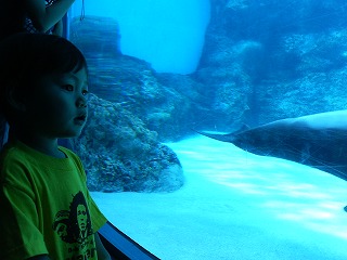 【2歳1ヶ月29日】今日は電車に乗って水族館へお出かけ。水族館に行くのは3度目。房総旅行で行った鴨川シーワルド以来だけど一年ぶりくらいなのかな~。水族館へ向かう時から超ハイテンションなたつくん。お父さんと一緒に電車に乗れるのが本当に嬉しいみたいで今日も『小猿さん』と化しマッコリにベッタリ。一番前の車両で運転士さん&前に広がる景色を観察。座席が空いてマッコリが座ろうとすると前を指差して「いっちばんまえ~っ!」と前に行くように指示。お父さんに抱っこされ電車の旅を楽しんでいた。水族館に入るとすぐに現れるイルカの水槽。これにはたつくんも大注目で吸い寄せられるように水槽前に行きイルカさん達の泳ぐ姿を夢中になってみていました。ちょうどイルカショーの時間だったのでまずかショーを見ることに。時間ぎりぎりだったから後ろの席からの観覧になってしまったが大きなビジョンがあるし後ろでも充分楽しめました。でもやっぱり一番前のいい席で見ると迫力も違うだろうから今度来る時は前の席で見せてあげたいな~なんてことも思ったよ。たつくんの反応はと言うとかなりいい感じ。あ~連れてきてあげてよかった♪とニヤニヤするくらいショーを楽しんでくれた。鴨川シーワルドに行った時の反応とはまた違っていて改めて近頃の成長を実感しました。イルカさんがバイバイしているのを見ると自分もバイバイしてみたりボールにジャンプする姿を見た後は興奮して「ジャップ~ン!ジャップ~ン!」と言っていたりいろんな刺激をうけたようで反応がすごかった。ショーの後は一旦外に出て近くのフードコートで昼食。フードコートといえばうどんがあるだろうと思っていたのにうどんのある店が近日オープンとのことでやっていない。たつくんの食べたそうなものを…と鮭のおにぎりを買ったのだがどうも気に入らなかったようで一口かじった後は食べようとせず「おうどん!おうどん、ちゅるちゅる~っ」と言い続け泣きそうな顔をしている。おにぎりはもういらない!とけじゃんの方によけてくるし大人用に買っていたものを出してみてもイヤイヤと拒否。うどんはないけどラーメンがあったので麺類なら大丈夫かな?!と買ってみたのだがラーメンは見るなりいらないとつき返されてしまった。。。何も食べようとしないのでおやつに持ってきた煮干を出したところ大喜びでムシャムシャ食べ始める。もしかのためにと持ってきていたクッキーもあったのでそれと牛乳を出すと食べてくれたけど他のご飯はまるで手をつけず。朝ごはんをかなりしっかり食べたからお腹が空いてなかったのかな…。そんなおやつな昼食しか食べていないたつくんだが午後からも絶好調に元気で水族館を楽しみました。外出前、今日はどのTシャツを着る?とたつくんに聞いたら「ボー!」と言いながらボブのTシャツをセレクト。このTシャツまだちょっとサイズが大きいから着るとちょっと不恰好なんだけどどれにする?と聞いた手前もあるしたつくんが選んだままに着せてしまった。ちゃんとこのTシャツの絵柄がボブだと教えたつもりはなかったけどいつの間にボブマーリーのTシャツと覚えたんだろう~。大ガメさんを観察中。ペンギンを見た後人形のペンギンに大喜びで「ギューッ」と言いながら抱きついていました。キュ~ッと抱きついている姿を撮ろうとしたのにシャッターチャンスを逃しなんかプロレス技をかけてるみたいな一枚になってしまった。。。本当はニッコ~と笑いながらキュって抱きしめていたんだよ~。一通り館内を見た後は地球と恐竜のシネマを見ることに。それぞれ40分間の上映でたつくんにとっては初めての映画体験。最初迫ってくるような映像がありちょっと怖かったみたいで嫌がったのだがマッコリの膝の上に座ってお父さんが楽しさをアピールしながら見ていたら怖くなくなったようで夢中になって見ていたよ。我が家にはテレビがないのでこんなに長い間映像を見るのも初めて。たつくんは一体どんなことを感じたのかな~。ほとんど一日水族館の中で過ごしたけどそんな長時間いたとは思えないくらいあっという間で思っていた以上に楽しい水族館だったから大満足~。今度は4人でまた来たいな♪水族館から出た後は広場でちょっとだけ遊んだのだがここでもたつくんは大ハッスル。昼寝を全くしていないのに芝生の上を走る走る走る!「とーさ~~~~ん!」とお父さんを呼び一緒に走ろう♪と誘い何度も何度も芝生の斜面を走り回っていました。その後は遊具のある場所で遊びそろそろ帰ろうと言うと嫌がってグズグズ。久しぶりに過ごすお父さんとの公園遊び、楽しくってたまらなかったみたい。夕食を食べた後、久々に再会したマッコリとお別れの時間。今回は2連休を取るのがやっとだったので名古屋駅でのお別れ。一応日中に少しだけ夜にはお父さんとバイバイだよと言ってみたけどその時のたつくんは聞こえない振りをして知らん振りしていた。本当は新幹線のホームまでお見