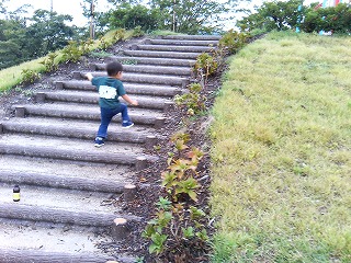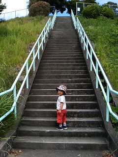 【2歳1ヶ月22日】今日はたつくんと二人で久々に公園へ遊びに行った。実家に来てから暑い日も続いていたし日中はなかなか出歩けずにいたけど今日は少し日差しも弱いような気がしたので11時過ぎから歩いて近所の公園にお出かけ。ここは前に実家に来た時も遊びに行ったことがあり今回はダーダーとたつくんの二人でも2度ほど遊びに来ている。ダーダーと来た時公園に続く長い階段を行きも帰りも一人で上り下りしたと聞いていたけど実際にちゃんと上る姿を見てちょっと感動。こんなにながーい階段も一人で快調に上って行けるほどに成長したんだよねー。けじゃんのお腹が大きくなってからはたつくんとしてもいろいろ感じることがあるからか外に出かけても「だっこ~!だっこ~!」とせがむことが多くて里帰り前は徒歩で出歩くとほとんど抱っこする羽目になっていたのだが実家に来てからダーダーに「たつは自分で歩かないとダメだぞ~」と言われたりダーダーと二人で出歩くうちに前のように自分で歩くことが増えてきて今日のけじゃんとの公園までの道のりも抱っこをせがみつつもなんやかんやと気をそらせていたらちゃんと一人で歩いてくれた。やっぱりいろんな人と関わっていろんなことを言われると子供って成長していくんだなぁと実感した。公園内ではヒラヒラと飛ぶ蝶々を観察したり遊具で思う存分遊んだり少し小高くなっている場所から勢い良く駆け下りたりとっても嬉しそうな顔をしながら遊んでいた。こんな風に二人で公園で遊ぶのはすごく久しぶりでたつくんが本当に楽しそうに駆け回る姿を見るのもすごく久しぶりに見たような気がした。そんなたつくんの笑顔を見ていたら心がすごくス~ッとしてけじゃんも元気をもらったよ。まだまだ母として未熟者だけど子供の笑顔が元気のもとになっているなんて自分も母親になったんだなぁ・・・気持ちだけは一人前の母親かな~なんてことを思ったりしたよ。この遊具も前に来た時はひろ君に乗せてもらっていたのにもう一人で軽々上り下りできるようになっていた。当たり前の成長なんだろうけれどそんな成長を目の当たりにするとなんだか感動で胸がいっぱいになってしまう。。。今日も感激しすぎの親ばかけじゃんでありました。午前中は体を動かして遊んだしこれで満足して昼寝をたっぷりしてくれるだろうと思っていたのに1時間も寝ないうちに物音で目を覚ましてすっかり元気モード。もう一度散歩に行く~!といい始め3時過ぎから実家の近所を散歩することに・・・。午前中のお出かけの時に公園でけじゃんのリュックを背負いたい!と譲らず大きすぎると言っても納得しないのでとりあえずと背負わせてみた。やってみたらたつくんも納得したようですぐにリュックを下ろしたのだがその時に「今度お出かけする時は たつくんの赤いリュックをしょって行こうね♪」とけじゃんが言った言葉をしっかり覚えていたようで本日2度目の外出用意をすませ出かけようとするとリュックを出して~と言いはじめた。そしてリュックを背負ってご機嫌におでかけ。午前中遊んだのとは別の近くの公園でしばらく遊びその後は近所をブラブラお散歩。暑くなってからはこんな風に公園で遊んだり近所を散歩する機会が減ってしまって家にこもることが多かったけど久々にのんびりゆったり出歩いてみるとこのなんてことのない、こうして過ごす時間が自分にとってはすごく大切な時間なんだなと感じた。これといった特別なものがあるわけじゃないんだけど走り回ったり景色を見たりそんなことで喜ぶたつくんの姿を見るのがけじゃんにとってはすごくすごく幸せなことなんだと実感した一日でした。