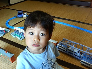 【2歳1ヶ月16日】今日の午前中はどこにも出かけず家でプラレールで遊んで過ごしたたつくん。大好きなダーダーと一緒に体操したり家の中をおおはしゃぎで走り回ったりもしていたけどほとんどの時間をプラレールで遊んで過ごしていたから体力がありあまっていたようで昼食後も昼寝をせずずっと電車を走らせ続けていました。朝晩はすっかり涼しくなって秋の気配も感じるようになったけど日中のさすような紫外線の強さは相変わらずでなかなか外に遊びに連れて行ってあげられない。午前中から公園に遊びにいけるようになるといいんだけどなぁ・・・。1時過ぎから昼寝をさせようとお布団をひいてけじゃんがゴロゴロしてみせても時々布団でゴロッとしてはすぐに去って行ってしまい気がついたら3時。このままじゃいけない!と布団を片付けベビーカーで郵便局まで出かけることにした。けじゃんの実家の近くはかなり急な坂道が続くので郵便局までの道のりはいい運動になったよ。たつくんはというと久々のベビーカーの揺れであっという間に夢の中へ。郵便局に着く前に眠ってしまった。家に戻ってからも眠り続け結局目覚めたのは5時過ぎ。こんな時間に昼寝してしまったこともあり今日の夕食&寝支度は遅くなってしまった。布団に入ってからもしばらくすると「フィ!フィ!」(←水のこと)と大騒ぎし水を飲みに行ったり(でも一口しか飲まなかったりする。)「チッチ!ウンチッチ~!」と言いはじめトイレに向かうもおしっこもうんちもせず便座で遊んでいたりなかなか寝付いてくれなかった。なんだかんだで寝たのは10時くらい。今日はすっかり宵っ張りになってしまった。早い時間にお昼寝してくれないとすぐに生活リズムがおかしくなっちゃうから困るんだよね~。ちゃんとした時間にお昼寝させるのって本当に難しいなぁ。。。今まで実家に来てもけじゃん以外とお風呂に入るのを嫌がっていたたつくん。一度大好きな従兄弟のひろくんがいる時になんとかごまかされてダーダーと3人で入ったことはあるけれどそれ以来はいつもけじゃんと入っていたのだが今日は初めてダーダーと二人でお風呂に入りました。だいぶダーダーには心を許してきたようで近頃のたつくんはなにかあると「ダーダー♪ダーダー♪」と今まで以上に言うようになってきたよ。この調子だったらお産の時にけじゃんがいなくても大丈夫になるかなぁ~・・・。