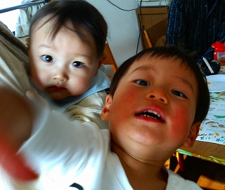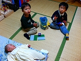 【たつくん2歳4ヵ月20日 ふみたん0歳2ヶ月13日】今日は友人のじゅうじゅくん一家が遊びに来てくれた。じゅうじゅくんはたつくんより2ヶ月下の男の子。今までの2人の関係はたつくん →せまる人じゅうじゅくん →にげる人ってな感じだった。0歳の頃は2ヶ月の成長差は結構大きかったからせまる&にげるな関係がすごく強かったけど2歳も過ぎたらその差はほとんどなくなり今回は玩具を取り合ったりもしながらも2人でじゃれあいながら遊んだりしていて前のせまる&にげるという感じではなくなって2歳の男の子たちだねぇ・・・という遊び方をするようになってきた気がする。じゅうじゅくんは保育園生活でもまれているからか以前よりたくましくなっていてえ~こんなに腕白になったんだー!とビックリしたよ。久しぶりの再会だったのでまだ2人の間にはお互いを探り合っているというかそんな感じの空気もあったけどこうやって遊ぶ機会を増やしていけばもっともっと仲良く一緒に遊べるようになるんだろうなぁ。ふみたんはというとじゅうじゅママが大好きみたいで抱っこされてもニコニコ。話しかけてもらったらもうご機嫌でエヘエヘ声を出して笑いまくりアーアーウーウーと声を出してしゃべりまくりそれはそれは嬉しそうでした。けじゃんが話しかけるときよりもいっぱい話していたような気が・・・。やっぱり普段話しかけてあげるの足りてないのかな。。。今日はマッコリが仕事だったので日中はじゅうじゅママ&パパにたつくんやふみたんの子守をしてもらったり家事を手伝ってもらったりして遊びに来てもらったのにおもてなしすることが全然できず逆にしてもらってばかりで本当に申し訳なかったよ。家に着くなり子供2人の世話をお願いしてけじゃんはスーパーに買い物に行ってしまったのだが普通だったら嫌がりそうなのにたつくんは全く嫌がらず楽しそうに家でお留守番していたしふみたんも泣かずに抱っこされていた。昼食後もたつくんはじゅうじゅ一家と近所にお散歩に出かけて行ったしそれは無理かな~と思っていたことが全然無理じゃなかったのにはビックリしたよ。でもこれはじゅうじゅママ&パパの人柄あってのことなんだけど。今日はいろんな意味でじゅうじゅ一家にお世話になりました。本当にありがとうね~。たつくんとじゅうじゅくんもかなりいい感じに遊べるようになってきた気がするのでまた遊ぶ機会をいっぱい作ってこの友情を深めていけるといいな。