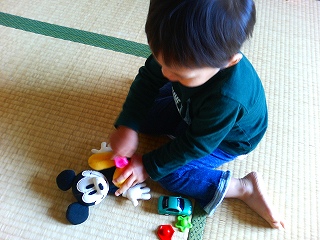【たつくん2歳4ヵ月11日 ふみたん0歳2ヶ月4日】たつくんはふみたんのことがとっても大好き。時々「ヒィィィィ~ッ」と思うようなおっかない行動をすることもあるけれど基本的にはかわいくて大切な妹・・・と思っているような感じ。眠るときはいつもけじゃんを真ん中にして左右にふみたんとたつくんが寝るという『小の字』スタイル。でもふみたんの横に行きたがって「こぉ~たぁぁぁ~い!こぉたぁ~~~~い!!」と言いながらけじゃんにどくように言ったりする。それを断るといきなり頭突きをしてどかせようとしたりしてけじゃんはかなりつらい目にあうことが度々。(場所をすぐにかわってあげられないこともあるから ちゃんと相手がいいよというまで待つようにと言い聞かせたら 今はいきなり頭突きをすることはなくなりました)そして場所を交代してあげると本当に嬉しそうな、幸せそうな顔をしながら「ふ~みちゃん♪」と言いながらふみちゃんの横にズリズリっと近寄って頭をよりそらせて寝ていたりする。泣いていると走っていっておなかをトントンとしてあげたりオムツをかえてあげようと洋服を脱がしたりけじゃん達がリビングにいる時、寝室にいるふみたんが泣くとけじゃんが気付くよりも先に「ふみちゃん!」と教えてくれたりもする。ハイローチェアーでふみたんがつまらなさそうにゴロンとしているとメリーをかけてくれるしかわいい妹のお世話をセッセとしてくれます。そんなたつくんの優しい気持ちをちゃんとくんであげてできるだけ自由にさせてあげたいとは思うけどお腹をトントンとする手に妙に力が入っていたりオムツをかえるだけなのに洋服を全部はだけさせしかも力いっぱい引っぱってボタンを外すので洋服とともにふみたんがひきずられていたり近づきすぎてたつくんの固い頭がふみたんにゴチンと当たっていたり・・・そんなことがあるとついつい心配になってしまいお世話しようとするたつくんに「あ~ダメダメ!」と言ってしまう。これって本当はよくないんだろうけど・・・もう少しふみたんの体がしっかりしてくるまでは無茶なことはさせたくないなぁと思ってしまうんだよね。できるだけダメではなくそういう時はこうやってやってあげるんだよと教えるようにしてはいるけどいつもいつもそんな風にはしてられないのが現実。。。そしてけじゃんがダメダメというからかいつの頃からかふみたんのかわりに大好きなミッキーをお世話するようになってきた。けじゃんがふみたんにおっぱいをあげているとたつくんも隣に座ってミッキーにおっぱいをあげる。「はい、チュッチュー。チュッチュー。」←おっぱい飲み中。「はい、ケプッ。」←ゲップださせ中。「ガージェ!ガージェ!」←吐き戻しのおっぱいふき取り中。そのお世話の仕方はかなりリアルでとってもかわいい。ふみたんを抱っこしてあやしているマッコリの後ろをミッキーを抱きながらついてまわってあやしたりもしている。二人目ということでたつくんが生まれた時のようにかまってもらえないふみたんのことをいじらしいなと思うことがたくさんあるけど今まで思いっきり注目され続けてきたのにそれが半減しかわいがりたいのに思うようにさせてもらえなかったり自分に注目して欲しくてもそれをあまり言わずに我慢しているたつくんのこともたまらなくいじらしい。無理な話だけど自分が2人欲しい気分です。2人ともに充分に接してあげられる余裕が今はないけれどけじゃんはたつくんのこともふみたんのことも本当に大切で、たまらなく大好きだからね~。そんな母の心は2人にちゃんと伝わっているかな。。。【世話する男】オムツがえ編ミッキーのお尻を拭いています。お尻を拭くコットンはお絵かきボードの備品。そしてオムツがなぜか車。こんなオムツアリ?!かなりいっぱい出ていたようでコットン一枚では拭ききれなかったらしくもう一枚を使って念入りに拭いてあげていたよ。それにしても・・・足の上げさせ方とか本当にちゃんと見てるよね・・・。お風呂編自分で小道具を用意して体を洗ってあげてから一緒にジャブーン。すっごく楽しそうに入っているからけじゃんも一緒に入れてもらいたくなっちゃったよ。いいな~、ミッキー。
