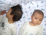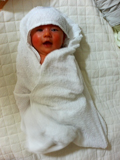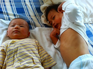 蒼ちゃんと初顔合わせした今宵、マッコリは所用があり外出。ということで週に一度の休日というのに今夜も3人で過ごすことに。。。一人で0歳児と2歳児の2人の子を風呂に入れ寝かしつける。これって結構大変なのだ~。でも大変大変!と思うとつらくなってしまうのでマッコリは2人と一緒に過ごせないけどけじゃんはこの愛しの子供達と一緒にいられるんだぞ~♪羨ましいでしょ~♪ウッシッシ♪などと思いながら3人の夜を楽しみました。お風呂上りにはこんなことをしてこれまた楽しんでみたよ~。【ふみたん、ぐるぐるまき~の巻】実はこれ、過去たつくんにもやっていて同じ格好をさせたらどんなもんかな~?と思いやってみたんだけど・・・。たつくんにやったのは5ヶ月の頃でこんな感じでした。【たつくんぐるぐるまき~の巻】今回はお風呂上りのたつくんのお世話もしたりしていたので巻き方がかなり甘い。次回もう一度チャレンジしなくては~。それにしてもこの2人・・・似てるなぁ。。。