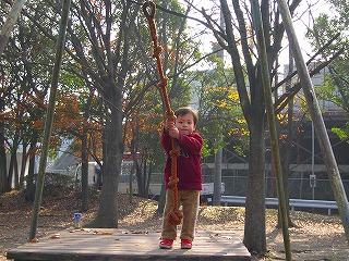 【たつくん2歳4ヵ月26日 ふみたん0歳2ヶ月19日】今日はマッコリの休日。ここしばらく思い切り外遊びをしていないたつくん。エネルギーを発散しきれずなんだかストレスがたまっているようなので午前中はマッコリと2人で外遊びに出かけた。家からちょっと遠いお店へ用事があり公園に行く前にそこに行ってもらったのだがその行き帰りもちゃんと自分で歩きそれから公園で1時間近く大喜びで遊んでいたみたい。こんなにたくさん動ける体力がついたというのに全然外で遊ばせてやれない毎日が続いていてたつくんにはかわいそうなことをしているよ・・・。なるべく時間を作って公園に行けるようにしてあげよう!と思うんだけど・・・。今の生活だとなかなかそれが実行できないんだよね。マッコリとの外遊びから帰ってきたたつくんは全身から喜びがあふれていて目もキラキラ、ニコニコで本当に満足した顔をしていた。たぶんけじゃんと一緒に行く公園遊びとは違うマッコリの『たつくんを鍛える強化合宿的公園遊び』がたまらなく楽しんだろうなぁ。普段行かない遠くの公園に連れて行ってもらえるし遊ばせ方もけじゃんとは全然違うしお父さんならではの特別な外遊びなんだよね。公園で遊んでいた時の様子を聞いたらビックリすることがいっぱい。いつのまにこんなことができるようになったの!と思うことだらけ。その中で一番ビックリしたのがコレ↓けじゃんの実家の近くの公園にもこういうターザンロープみたいな玩具があり里帰り中にダーダーさんと一緒にこれをやったりしていたしずいぶん前にこの公園に3人で来た時にマッコリと一緒にぶらさがって遊んでいたことはあったけど今回なんとこれに一人でぶらさがって遊んだのだ!!!なんと頼もしいたつくんの背中だこと。。。すごい!すごい!!すごすぎるぅ~~~~!こんなことができるようになったたつくんにもビックリしたけどこれを2歳のたつくんに一人でやらせちゃうマッコリにもビックリ。ちなみに公園にいた他の人たちもかなりビックリしていたみたいで「うちの子は5歳になってやっとできたんですよー」と言われたらしい。けじゃんだったらもし落ちたら・・・と考えて絶対にさせられないもの。保守的なけじゃんとイケイケドンドンなマッコリ。2人でちょうどいいバランスをとっているように思うしけじゃんが一緒にいると怖いからそんなことさせないで~となってしまうのでこうしてお父さんとの2人遊びの時間はたつくんにとってとても大切だなとしみじみ思うよ。この公園遊びの時に同じ年頃の子供達がいて一緒に遊んだりしたらしいのだが保育園に通っているという2歳(お兄ちゃん有り)の男の子がとてもしっかりしていたらしく家に帰ってきてからのマッコリはしきりに「なんかたつが妙にひ弱に感じて・・・ 温室育ちだな~って感じで・・・・・・ もっともっとたくましくなるように鍛えないと!!!」と言って、たつくんの今の状況を嘆いていたよ。。。確かに保育園に行っていたり上に兄弟がいる子のようにはもまれていないからそう感じる部分はあるけどね。。。こういうことをマッコリは以前から言っていてそれを聞くたびにけじゃんは心の中で「確かにそういう部分はあるけど・・・ でもマッコリの子なんだから無理に鍛えなくても 自然とちゃんとたくましく育っていくと思うんだけどなぁ~」とつぶやいているんだよね。触れ合う時間は少ないけれど子はちゃんと父の背中をみているよ。だからマッコリがそんなに心配しなくてもたつくんは大丈夫だと思う。今ある心優しい気持ちも育みながらたくましさ、本当の男らしさも育まれていくように素敵な背中を見せ続けていてね、マッコリ♪おまけ。。。今日の日記のタイトルはマッコリの心の声を代弁してみました。そして・・・すごく懐かしいものを見つけちゃったよ。フフフフッ。本当にわんぱくでもいい たくましく育ってほしい・・・だね。