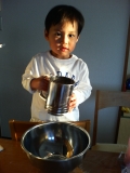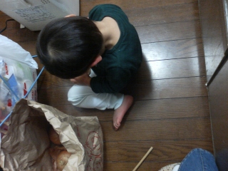 【たつくん2歳4ヵ月16日 ふみたん0歳2ヶ月9日】さて、問題です。今たつくんは何をしているのでしょうか?正解は・・・コレ↓玉葱の皮むきでした~。ずいぶん前からけじゃんが台所で家事をしているとそこにやってきてはいろんなものに興味津々だったたつくん。何かをやりたがった時はできる範囲でお手伝いしてもらいなるべく『ダメダメ』と言わないようにしていた。その中で大好きな仕事のひとつが玉葱の皮むきのお手伝い。前はけじゃんが少しめくってあげてむきやすいようにしたのをたつくんがペリペリはがしていて2人で一緒にやっていたのだがいつの間にか一人でできるようになっていた。なので最近は夕食の準備の時に「たつく~ん、玉葱の皮をむいてくれる?」と声をかけるようにしている。そうしないとけじゃんがむいているのを見て自分もやりたがって使う必要もない玉葱をむいちゃうんだよね~。なぜだか玉葱の皮むきがすっごく大好きみたい。ちょっと時間はかかるけどとっても上手にペリペリと皮をむくこのたつくんの姿を見るのがけじゃんは大好き。うなだれたような姿勢で真剣に皮むきに没頭しているたつくんがたまらなくかわいいのだ。そして、たつくんの剥いてくれた玉葱で作ると料理が格別な味になるんだよ~♪これからもお手伝いヨロシクね!!