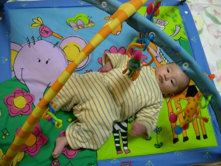 【たつくん2歳5ヵ月3日 ふみたん0歳2ヶ月26日】たつくんが4ヶ月の頃に購入したタイニーラブのジミニーアクティビティ。約2年ぶりに再び登場~。ずっと出そう出そうと思いつつなんだかんだと後回しにしてしまっていたけど(使わないベビーグッズは簡単に出せない ベッドの下にしまいこんであるのだ)やっと出すことができた。早速ふみたんを寝かせてみたらすごい反応していてあっちをキョロキョロこっちをキョロキョロ。いろんなものがぶらさがっているし触れるとブンブンと揺れるしかなり興味津々になっていた。寝かせる前は少しグズリ気味だったんだけどここに寝かせたらぐずっていたことも忘れひたすら猿さんや鳥さんたちをジーッと凝視。かなり長い時間一人で遊んでいてくれたよ。【ふみたんvsとりさん】かれこれ一時間、このにらみ合いは続いております。(←ウソ)たつくんの時にも思ったけどこのプレイジムは子供心をすごくひきつけるみたいで買ってよかったな~と本当に思う。今はまだねんねしたまま見たり手足で触れたりしかできないけど寝返りを打てるようになっていろいろ遊べるようになるのが楽しみだなぁ。ちなみにこれで遊んでいたたつくんはこんな感じでした。0歳のたつくん、懐かしいよぉー!!!なにげに足をつっぱらせてバーを押しているのも懐かしい!そうそう、こうやって遊んでいたんだよね~。自分が遊んでいたことを覚えているのかいないのか、久々に登場したプレイジムたつくんは大喜び。ふみたんの横に寝転がり遊びまくっていたよ。た→「ふみ、いいか。これはこういう風にして遊ぶんだ。」ふ→「フムフム。」ふみたんへジムの遊び方を指導した後は一人遊びに突入~。飾ってあったクリスマスの人形とクマさんを大事なショベルカー&ブルドーザーに乗せすごく楽しそうに遊んでいました。明日はクリスマスイブ。今年こそサンタさんが我が家に来てくれるといいね~。過去日記も更新しました。12月 6日何をしてるの?12月20日