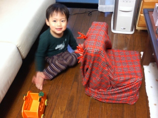 【たつくん2歳5ヵ月5日 ふみたん0歳2ヶ月28日】たつくんが生まれてから3度目のクリスマス。今までの2回はサンタさんは我が家を素通りしていたのだが今年は初めてサンタさんがやってきたのだー!クリスマスイブの昨日。寝る前にベッドに靴下を吊り下げ就寝。そして目覚めて靴下の中を見ると・・・たつくんの大好きなプリウス(←もちろんトミカのね)が入っていました。近頃すっかり遅起きなたつくん。今朝もマッコリが会社に行ってからの起床だったので靴下の中のプレゼントを見つける姿をけじゃんがビデオ撮影。なので写真は撮れなかったんだけど嬉しそうに包みをあける姿にはジーンとしてしまった。やっとサンタさんが来てくれてよかったね♪今回プレゼントしてもらったトミカ。なぜプリウスかというと・・・。マイカーを持たない我が家では必要な時はレンタカーを利用している。たつくんが2歳になった昨年の7月に1泊2日の温泉旅行をしたのだがその時にプリウスを借りた。1泊2日だししっかり車を見る時間なんてそんなになかったはずなのにその旅行以来道でプリウスを見つけると「とーさんブーブ。おんせんいった」と言うようになったたつくん。けじゃんの実家に里帰りしてからも車に乗っていて走っているのを見るとすぐに見つけて「とーさんブーブ。」前からでも後ろからでも横からでもプリウスを見つけるとすぐに分かる。大きな広告看板を見つけてもやっぱり「とーさんブーブ。」プリウスという名前を教えてあげるとあっという間に名前を覚え見かけると「プリゥス!」と言うようになった。なんだかすごく気に入っているみたいなのでたつくんに代わってけじゃんがサンタさんに「プリウスをプレゼントしてくださーい」とお願いしたのである。本人が欲しいと言ったわけじゃないけれど元々持っているフェアレディZがなんとなく似ているからか「プリゥス」と言って遊んでいたりするのを見てたからきっとプリウスがあったら喜ぶだろうな・・・と思ったのだ。そして実際の反応はというとかなり大喜び。今日は一日プリウスで遊びまくっていたよ。お昼ご飯を食べた後、夕食の買い物に出かけたのだがスーパーに入って一番に目に飛び込んできたのがいちご。クリスマスといえば苺。ケーキを作る人の為にか妙に大きくて値段の張る苺がすごく目に付きやすい所にドドーンと置いてありそんな状況で大好きな苺をたつくんが見逃すはずもなく見るなり「いちごー!たちゅ、いちご食べたい!」と苺の前で立ち止まってしまった。そういえば2年前はクリスマスだし~とケーキを焼いたけどその頃はたつくんはケーキは食べられず。去年はそれどころじゃなくて何もしなかったような・・・。今年はたつくんに手伝ってもらって作ってみようかな?!なんて突然思い立ち午後はケーキを焼いてみた。粉をふるったりたつくんにも手伝ってもらったけどこんな風に一緒にケーキを作れるなんてなんだかとっても幸せ~♪ケーキが焼きに入ってからはオーブンから離れず。。。自分で椅子を持ってきてずーっとずっと焼き具合のチェック。が、知らないうちにスイッチを押していて気がついたらオーブンが消えていた!!!慌ててもう一度つけたけど焼き時間が分からなくなってしまったのだ。とんだハプニング。。。そして生地が焼き上がり冷ましたスポンジをカットしている時切れ端をつまみ食いしたのをたつくんに見つかってしまった。欲しい欲しいと大騒ぎするのでたつくんにもつまみ食いさせてあげると今度はもっと食べたい!と大騒ぎ。なだめるのに本当に一苦労でした。最初は「一緒にケーキ作りができて幸せ~♪」などと呑気に幸せをかみしめていたけどつまみ食い後はそんな幸せどこへやら。。。甘くって美味しいからそりゃもっと食べたくなるよね~。そんなすったもんだがありながらもなんとか出来上がり。我が家にはパレットナイフがないのでゴムベラで生クリームをペタペタ。2年前同様、ビックリするくらいヘタなデコレーション。しかも上にのせる苺をたつくんにも食べやすいようにと二つに切っちゃっているからこれまたブサイク。でもこんな見た目だけどたつくんもふみたんも喜んでくれました。例年通り夕食メニューはクリスマスはいずこへ?!ってな和食メニュー。今日はブリの照り焼きでした。つつましい夕食後、楽しい楽しいケーキタイム。久々のロウソクつきケーキにたつくんは大喜び。たつくんの「フーッ」を見てけじゃん大喜び。来年はちゃんとパレットナイフも買ってもう少し見た目も素敵なケーキが作れるようになりたいなぁ。。。でも、けじゃんのまだまだ修行が足りぬケーキでもみんなでおいしいね~って言いながら食べるとお店で買うケーキよりもずっと美味しく感じるんだよね。これぞ愛の力か?!なにはともあれ家族で笑いながら過ごす夕べはとっても楽しかったよ~。来年はふみたんも食べれるケーキを焼くから楽しみにしていてね♪