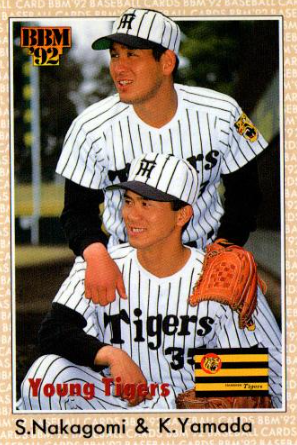 背番号27(その7)背番号27の第7回目です前回は笠間さん嶋田さんと捕手が続いたんだけど 嶋田さんのあとを受け継いだのも捕手なのよね そのあとさらに捕手捕手と続きますなので今回ご紹介する3名はすべて捕手なのよ! 笠間さんに始まって5人の捕手が連続で着けるって 背番号「27」はそういう位置づけの番号になってきたのかな? まあとにかく読んでみて!山田 勝彦 捕手山田は愛知県名古屋市出身で強豪として知られる東邦高校。高校2年時には控えの投手として選抜大会に出場したが1回戦で敗退。このときリリーフで登板している。秋に新チームとなって本格的に捕手に転向するとみるみる力をつけ、東海地区ナンバーワン捕手と評価されるようになる。バッティングも好く高校通算で24本塁打を記録している。1987(昭和62)年のドラフト会議ではタイガースから3巡目で指名されて入団する。最初につけた背番号は「61」だった。ルーキーの1988(昭和63)年はファームで33試合、2年目の1989(平成元)年に初めて一軍に上がるが、出場したのは1試合のみ。3年目の1990(平成2)年はまた1年間ファームで過ごした。1991(平成3)年から一軍戦力の一角として認められるようになり、この年は66試合に出ているが打率.128。期待されていた打撃は伸びてこなかった。 背番号が「35」に変わった1992(平成4)年、「新亀フィーバー」に乗っかるように山田も台頭し、生涯唯一の100試合以上の出場を果たしている。成績は114試合313打数64安打31打点4本塁打、打率.203というもので、これがキャリアハイとなった。またこの年で嶋田が引退したため1993(平成4)年から背番号を「27」に変更している。当時は1990年に入団してきた関川耕一が強力なライバルとして存在していたため、なかなか正捕手定着ができなかった事情がある。捕手としては拮抗していたがバッティングでは関川のほうが優っていたし足も使えた。そのため関川は打力と俊足を生かせる外野手に転向していき、1996(平成8)~1997(平成9)年は山田が正捕手の座についている。ところが1997年のオフに関川がトレードで中日ドラゴンズに移り、交換で移籍してきた矢野燿大が強力なライバルとして立ちふさがったため、出場機会は激減していく。1998(平成10)年は矢野が110試合、山田は69試合とレギュラーの座を奪われ、以降は21試合、45試合、54試合、39試合と控えに甘んじている。2002(平成14)年には星野監督が就任し、そのオフに戦力構想から外れて伊達昌司とともに日本ハムファイターズへトレードされてしまった。日本ハムでは3年間プレーしており、最初の2003(平成15)年こそ40試合に出ているが、2年目が3試合、3年目は1試合に終わり2005(平成17)年オフに現役を退いた。引退後は楽天、オリックス、阪神でバッテリーコーチなどを務め、2022(令和4)年からはかつての同僚だった新庄剛志が監督を務める日本ハムで一軍バッテリーコーチを務めている(2024年現在)。通算成績は795試合1753打数360安打130打点21本塁打、93四球388三振、打率.205である。野口 寿浩 捕手(再掲)野口は背番号2で先代が紹介済みだが、非常に簡略な紹介に終わっているので詳細に改訂して掲載する。千葉県習志野市出身で高校は習志野高校。高校時代は甲子園に出場する機会はなく、1989(平成元)年にドラフト外でヤクルト・スワローズへ入団している。ヤクルトでは1990(平成2)年から1997(平成9)年まで8年間プレーしているが、古田敦也という壁が立ちふさがっており、出場機会に恵まれることが少ない状況でくすぶっていた。1998(平成10)年に、捕手不足に悩んでいた日本ハムへトレードされて視界が広がり、在籍5年間のうち4シーズンで100試合以上に出場している。在籍3年目の2000(平成12)年がキャリアハイで、134試合459打数137安打76打点11本塁打、打率.298という好成績を残す主力メンバーだった。ところが2002(平成14)年オフ、星野監督の大改革に巻き込まれてタイガースに移籍すると、矢野燿大というライバルにブチ当たってしまう。タイガースには2003(平成15)年から6年間在籍しており、2度のリーグ優勝にも控え捕手として貢献、2004(平成16)年には井川慶とのバッテリーでノーヒットノーランを達成するなど、出場機会は少ないが存在感を示している。実際に星野監督も「矢野と同じぐらいの力を持つ捕手はいざと言う時に効く。野口が一番の補強」と語ったほどだった。背番号は「27」を2年間背負った後、2005(平成17)年に「2」に変えて4年間着けている。野口は肩も強くキャッチングやインサイドワークもしっかりしており捕手としての能力は高いしバッティングもいい。しかしタイガースでの6年間の試合出場は、59試合、24試合、18試合、16試合、36試合、55試合にとどまり、あまりにも機会に恵まれない不運な選手だった2008(平成20)年オフ、野口はFA権を行使して横浜ベイスターズへ移籍する。2009(平成21)年はケガのため17試合の出場にとどまり、2010(平成22)年は屈辱の二軍スタートで、一軍では2試合に出ただけ、10月には戦力外を通告されてしまう。野口は現役をあきら