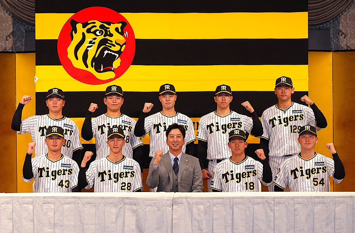 2024年新人選手入団発表会心の準備はできたかな?2代目タイガース非公式サイトですみなさんこんにちは2024年12月9日 親入団選手の合同入団発表会がありましたねちょっと遅くなってしまったけど 球団発表のニュースから各選手の自己アピールなどを拾ってみたよ みんなで応援しよう!藤川球児監督のことば 今、私たち阪神タイガースの戦力というのは12球団で屈指だと自負しております。その中でこの9人の選手、育成選手もいますけれどもすごく激しい競争があると思います。私たち阪神タイガースが立派に彼らを育て上げて、親御さんの元を離れて素晴らしい社会人、それからプロ野球選手として活躍してくれる姿を想像しますが、それぞれ特徴が違いますから、それは選手たちから自己アピールを聞いてみたいですね。伊原陵人選手 ドラフト第1巡目 背番号1818番はプロ野球界でもエースナンバーと言われる番号なので、とにかくこの番号に恥じないように一生懸命自分のプレーができればいいなと思います。コントロールが一番自信を持っているところなので、そこは大事にしたいなということ、ボールのキレも一つ自分の持ち味なので、そこも見ていただきたいということ。あとピッチングスタイルは強気に攻めるというところが持ち味ですので、前面に出してマウンドで力を発揮したいなと思います。18番と言えば伊原だと言われるように頑張りたいと思いますし、その先には日本代表というところも目標に、阪神タイガースのエースになれるように頑張りたいと思います。藤川球児監督やっぱり即戦力で1年目から活躍してもらいたいなと強く願っています。彼の持ち味であるコントロール、キレ。私が一番彼の特徴的だなと思うのは右バッター、左バッターの内角の素晴らしいストレート。このボールを持って、各球団の主力のバッターたちに強烈な一発を残してもらいたいなと思っています。今朝丸裕喜選手 ドラフト第2巡目 背番号28 地元の甲子園で結果を出したいというところが一番大きかったので、そこが一番嬉しかった部分です。身長を活かした角度のあるストレートとコントロールというところが自分の武器です。まずはその伸びるストレートはどうやって投げるのかというところを一番は才木選手に聞いてみたいと思います。藤川球児監督今朝丸投手がドラフト2巡目に残っていてくれたことが、この阪神タイガースにとって非常に大きいですね。本当にありがたいことにご縁がありました。なので、彼には2年、3年、4年、5年と時間をかけて成長してもらいたいなと思います。私自身もすごく一軍で出るまで時間がかかりました。急がば回れという言葉もありますから、ゆっくりじっくり球団の新しい施設でのびのびやってもらって、近未来にエースとして出てきてもらえると信じています。木下里都選手 ドラフト第3巡目 背番号54今までピッチャーをやってきて、ずっと真っすぐに自信を持って投げてきていますし、一番磨いてきたところでもありますので、やっぱりそれを生かした力強いピッチングをお見せできたらと思います。54番の背番号は阪神タイガースにとって、一時代を担ってきたメッセンジャー投手の大事な番号ですし、その番号をいただく際にもやっぱりタイガースにとって大事な番号と言って渡していただいたので、本当に期待していただいていると思いますので、その期待に応えていかないといけないなという思いです。156キロというマックスのスピードがありますが、大台の160キロに乗っていきたいという気持ちもありますし、即戦力とも言っていただいたので、開幕の一軍を目指してまずは取り組んでいきたいという気持ちと、1年間怪我無く、勝利に貢献していきたいと思います。町田隼乙選手 ドラフト第4巡目 背番号43ずっとNPBのユニフォームを着たいと思ってやってきましたし、阪神タイガースという歴史や伝統のある球団に入らせていただいたので、それに恥じないような選手になっていきたいと思っています。背の高い大きいキャッチャーというところと、強肩が売りです。阪神タイガースで言えば、梅野さん、坂本さんなど第一線で活躍されているキャッチャーがいるので、その方にまず負けないように、そして超えていけるような選手になりたいと思います。独立リーグという厳しい環境でやってきたという自信もありますし、独立リーグ出身でNPBの舞台で活躍できれば、もっと独立リーグへの見方も変わってくると思うので、そういうのを代表できるように頑張りたいと思います。佐野大陽選手 ドラフト第5巡目 背番号45野球人生で初めての縦縞のユニフォームを、この伝統のある阪神タイガースで着ることができて、とても光栄に思います。指名漏れを経験して、この1年野球だけをやってきました。独立リーグで1年間、野球人としてすごく勉強させてもらいましたし、富山の球団には感謝しかありません。正確な送球、正確な補球、堅実な守備がセールスポイントだと思いま