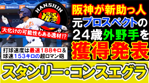 阪神が前メッツ傘下2Aのスタンリー・コンスエグラ外野手(24)と育成契約で合意に達した。嶌村球団本部長が兵庫・西宮市内の球団事務所で取材に応じ、「12月のドミニカでのトライアウトで。外野手に重きを置きながら(獲得に動いた)」と説明した。