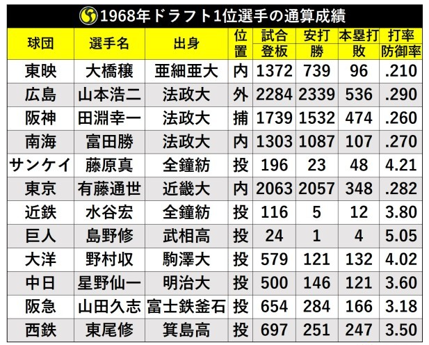 1968(昭和43)年のドラフト会議でタイガースの2位指名を受けて入団し、1年目は背番号「5」を着けている。この年のドラフト会議は 今でも 空前の大豊作と言われており、1位のメンバーは次表の顔ぶれだった。