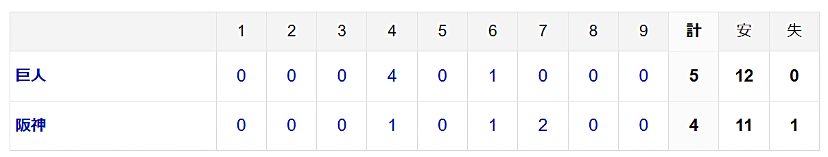 阪神4-5巨人 11回戦 阪神8勝3敗(甲子園)