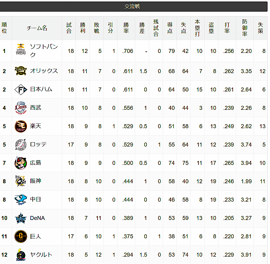 残念ながら交流戦 18 試合 8 勝 10 敗の 8 位タイ