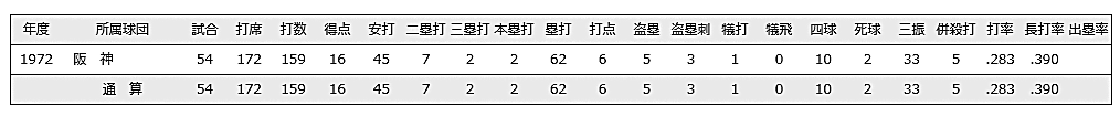 阪神在籍 : 1年 54試合159打数45安打6打点2本塁打12四死球33三振5盗塁 打率.283