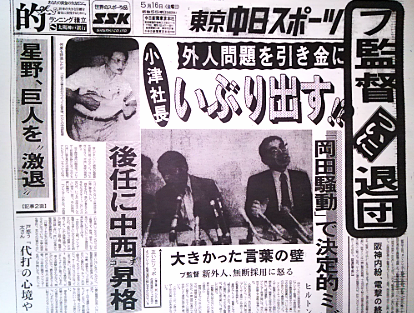 5月14日の大洋7回戦の試合後、小津社長と監督が話し合いを持ち、この席でブレイザー監督は「新外国人の選定は現場責任者を無視して勝手に話が進んでいる」とフロントのやり方に反発して辞意を表明する。