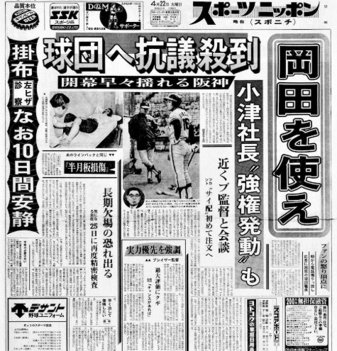 一方の岡田は開幕からベンチを暖めており、初出場は4試合目の大洋1回戦の代打だった。「岡田を起用しろ!」というファンの声は高まり、18日に掛布が捻挫でリタイアしたあと、空いたサードに佐野が起用されるに及んで、 阪神ファンは 「なぜ岡田じゃないんだ!」と怒り心頭に達した。そ のフラストレーションは爆発寸前の状態になる。
