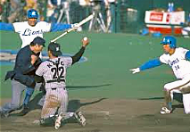 2-1で迎えた7回裏の一死一・三塁のピンチでは、辻のプッシュバントに素早く反応したバースは素手でボールをつかむと執念のバックホーム。