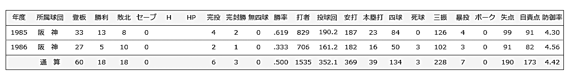阪神在籍:2年 60 試合 18 勝 18 敗 353 回 1/3 228 奪三振 自責点 173 防御率 4.42
