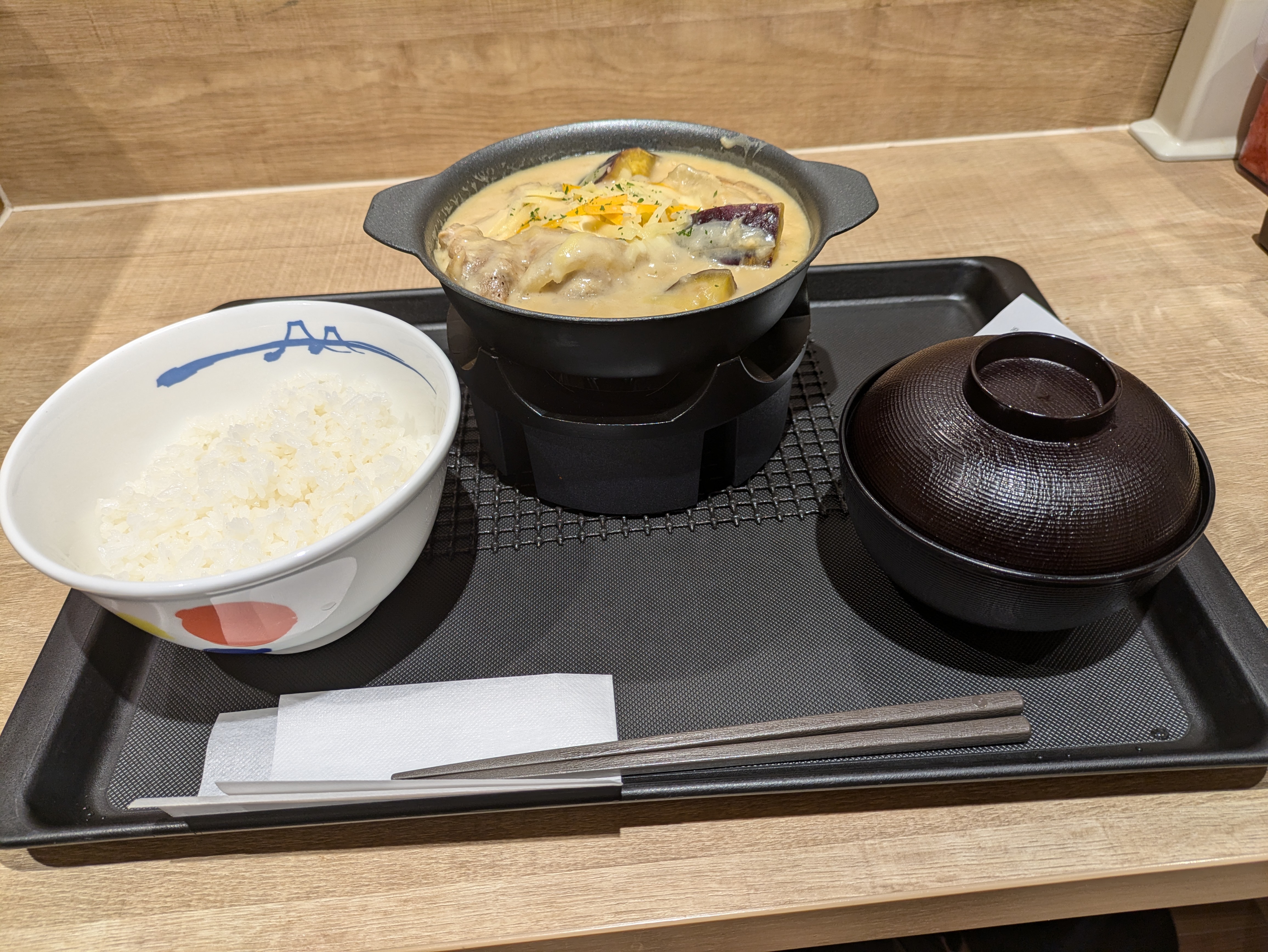 松屋のシュクメルリ定食です。ジョージアのお料理ですよ。ニンニクが効いていて、美味しかったです。寒い日には身体が温まりますね。