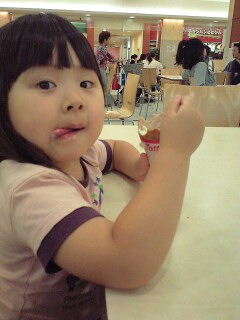 日曜日のおでかけ。でも小雨がぱらついてお出かけしづらい・・・。 というわけで家族そろって車でショッピングモールへ。 子供たち用のタオルケットを探しにやってきたのに、好みのものが見つからず本日の目的終了 特に必要なものもなかったのでみんなでおやつを食べることに。 ナナちゃんソフトクリームをペロリ。てか、それママのなんだけどね・・・。でもアイスがなんてよく似合う ココちゃんはパパのお膝で。その前にはかき氷の残骸が。 パパがどうしてもかき氷気分ということで食べてました。 でも今日のお買物で¥998のかき氷機を発見。即買いしてきたばっかりだったのに待ちきれなかったようです。