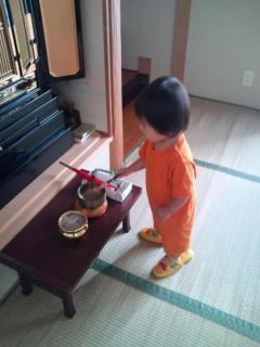 今日と明日はパパとママが連休。というわけでみんなでパパの実家へ行くことに。車で1時間弱の距離なのでそんなに遠くはないけれど、せっかく行くならゆっくりしたいので、毎月1回、1泊か2泊しています。 こどもたちはここに来るのが大好き。田舎町だから家は広いし、庭は広いし、家の前も私道だから安心して遊べるし、自転車はあるし、大きな犬はいるし。こどもたちにとっては楽園なんでしょう。 かく言うわたしも実家へ帰ってくると家事と育児から解放されいつもの~んびりさせてもらっているので感謝です。 さてここには自宅にないものがあります。それは・・・仏壇。 ここに来るとココは必ず仏壇の前に行って ほら、ちゃんと鈴を鳴らしています。それから数珠を手にとって、 「まんまんちゃん あんっ!」 一人で上手にお参りしてました。 いつもお散歩の時にお地蔵さんに"あん"としているのでお参りするのはとっても上手。 畳の上でスリッパなのは失礼します。近頃スリッパが大のお気に入り。サイズ20センチの大きなスリッパを履きこなしてます。