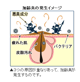 加齢臭とは,男女に関係なく出る中高年特有の体臭。汗が汗腺から発生するのに対し、加齢臭は皮脂腺から分泌される過酸化脂質と脂肪酸が酸化分解されて発生する体臭成分「ノネナール」が原因とされている。 ノネナールは青くさく、脂くさいような独特のにおいで、女性も更年期になると女性ホルモンの減少で、においが強くなる。 なお,「オヤジ臭い」というのは加齢臭ではなく,タバコやアルコール、整髪料、焼き肉など食物のにおいなどが混ざり合ったにおい。飲酒も発汗量を急激に増加させる。過度のストレスは副腎皮質ホルモン、男性ホルモンなどを大量に放出して皮脂の分泌を盛んにし、体臭の原因になるという。 ◇ ◆ ◇ ◆ ◇ ◆ ◇ ◆ ◇ ◆ ◇ ◆ ◇ ◆ ◇ ◆□☆30代からのニオイ対策□☆ 男性は30代になると皮脂の分泌が盛んになる。その皮脂が酸化し、使い古した油のような体臭を発するようになる。 ライオン(東京都墨田区)は今春、ボディーソープなどのデオドラント商品「PRO TEC STYLE(プロテク スタイル)」を発売した。商品に張られた「男30 ニオイの変化に着目」のシールが目を引く。 資生堂(中央区)は殺菌効果のある銀イオンに着目し、雑菌と汗が混ざってにおいが発生するのを抑制する「銀含有ゼオライト」を配合した制汗剤「Ag+(エージープラス)」シリーズを発売している。 株式会社エモテントの「柿渋石けん」。加齢臭をはじめとする体のニオイ、肌の変化などを感じる男性を中心に売れており、販売個数15万個を突破したという。 ↓ 加齢臭は、「皮脂汚れ」、「バクテリア」、そして「肌の疲れ」の3つが重なりあって発生しているの。「柿渋石けん」の泡には、加齢臭のことを考えに考えた成分が独自配合されており、3つの力で加齢臭を防いでくれるという。 商品名送料無料2個セット+レビューで・・・柿渋の泡が加齢臭や汗の臭いを予防!コシのある泡で汚れを吸着♪【あす楽対応_東北】~【あす楽対応_九州】★【宅急便送料無料】【あす楽対応_関東】【あす楽対応_東海】柿渋石鹸「渋玉/SHIBUTAMA/しぶたま」100g×2個セット商品説明これもオススメPowered by HTNM■このページの商品は北海道・沖縄県・青森県・長崎県・宮崎県・鹿児島県・離島を除く下記地域に対応しています。 ■あす楽は宅急便にのみ対応しております。詳細につきましては当ページ下部にございます説明をご確認ください。 【あす楽対応_東北】【あす楽対応_関東】【あす楽対応_甲信越】【あす楽対応_北陸】 【あ・・・[続き]2,980円(税込・送料込)ショップ名:えこじじいの店レビュー件数:276レビュー平均点:(4.38)この記事は楽アフィサーチ(ベータ版)で作成しています。【楽天市場】ランキング市場 【美容・コスメ・香水・ボディケア・石けん・ボディ洗浄料】(2009/06/12)レビュー 0件1位:【すっごいボディソープ】■送...レビュー 486件2位:【ポイント10倍!】【50%OFF...レビュー 1件3位:ポイント最大7倍激安!60%OFF...レビュー 933件4位:ポイント最大7倍53%OFF当店リ...レビュー 2件5位:★ポイント10倍♪5月30日~6月3...[関連ブログ]汗