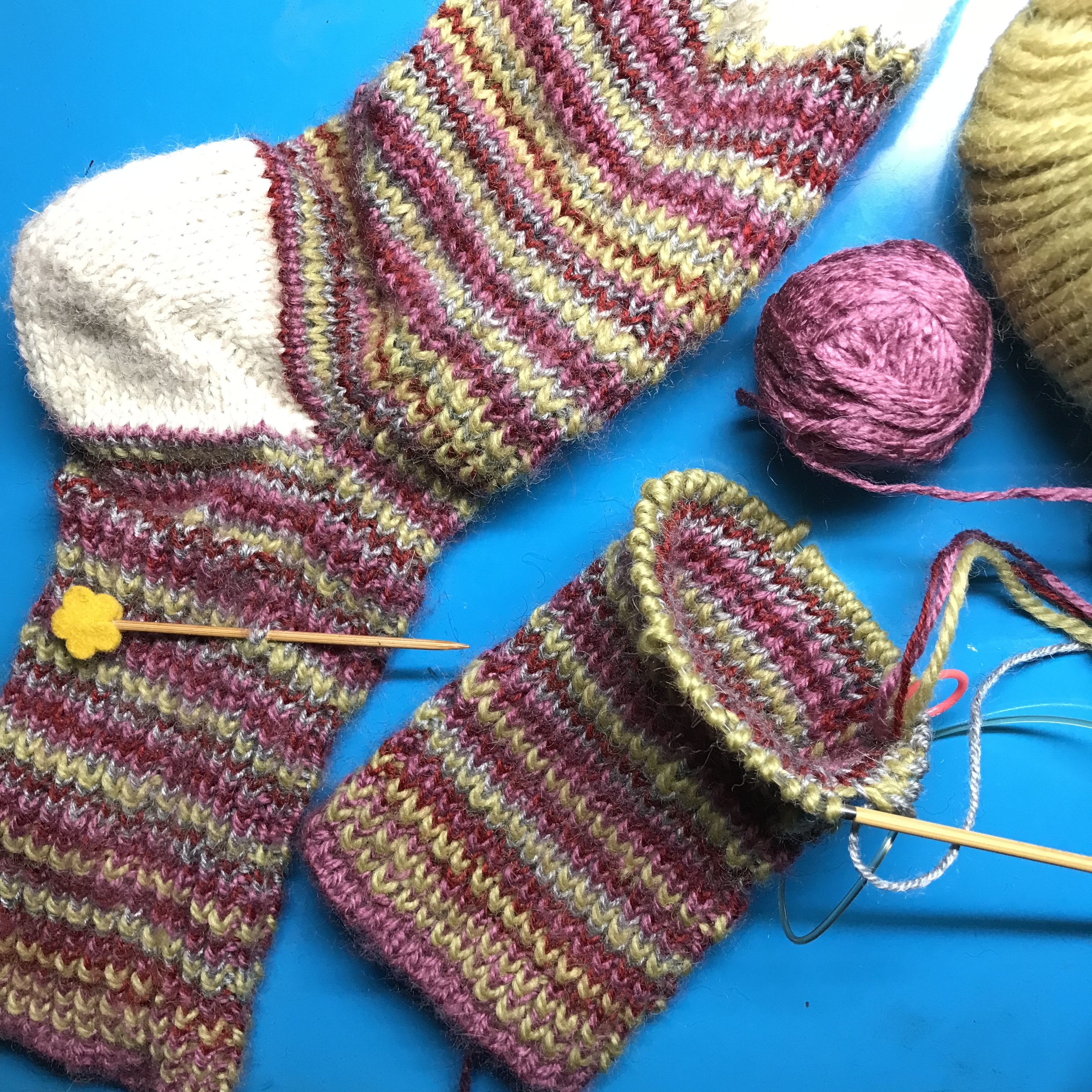 寒波が去って 今週は春風が吹くらしいが 今朝はミゾレ雨模様 さぶい!ジャマイカ!鼻水ふきふき 2月末〆の帳簿付け事務仕事 外出した先の待ち時間も コツコツ靴下編み‥改良した履き口の柔らかな伸び具合に 大満足!指で作るゴミ編みの作り目 1往復袋編みなんではよぉに せんやったんやろぉ〜残り糸の消費の 表目ねじりの一目ゴム縞模様‥外で編む時も カウントしやすいオッ、指なし手袋やレッグウォーマーにも使えるナ今年65熟年にもなれば 人ゴミの中でも隔離世界雑音を気にしない〜♪