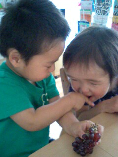 ふと見ると、てっちゃんが、い~ちゃんにデラウエアを、あ~ん。