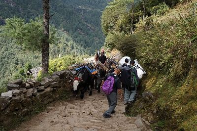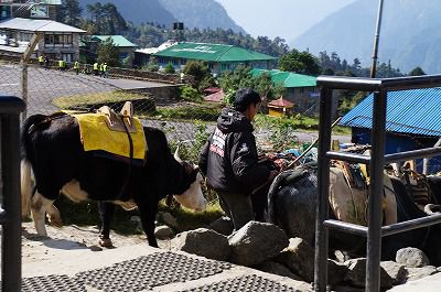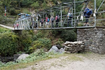 すぐ下り坂 牛(ヤク)の後をついて歩く 橋を渡っり