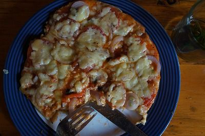 先ずは昼食 オニオントマトピザ・ミントティー を食べる