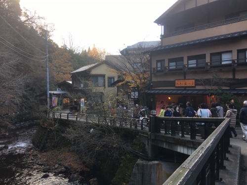 ここ、黒川温泉は旅館組合の主導で歓楽的要素や派手な看板を廃して統一的な町並みを